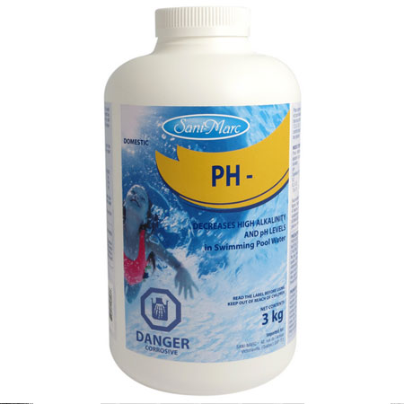 Sprinkle pH- on surface of pool water. Let water circulate for 4 hours after adding the product, then check pH. Make necessary adjustments.[tabbyending]